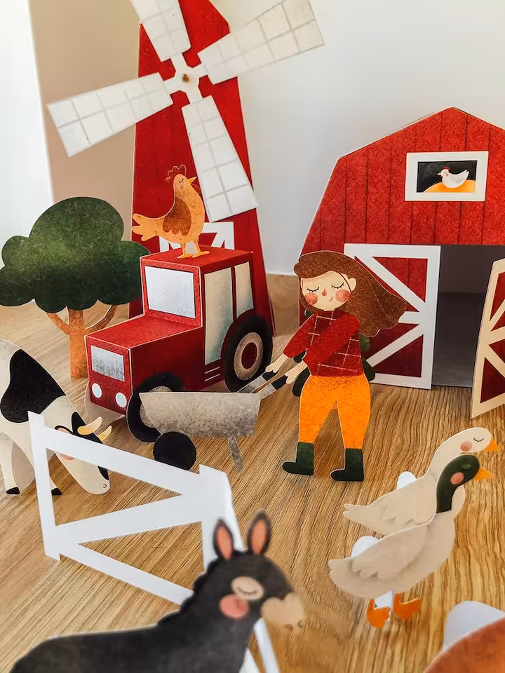 -gospodarstwo do złożenia (stodoła, traktor, wiatrak, snopki siana, zwierzęta, farmerka, farmerkę, drzewa)