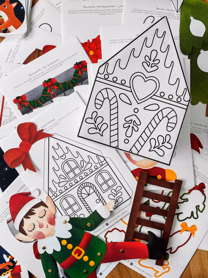 -25 kreatywnych zadań do zrobienia (min. Pokolorowanie i złożenie domku z piernika, dziadek do orzechów, instrukcja jak narysować, zaprojektuj bombkę i wiele innych)